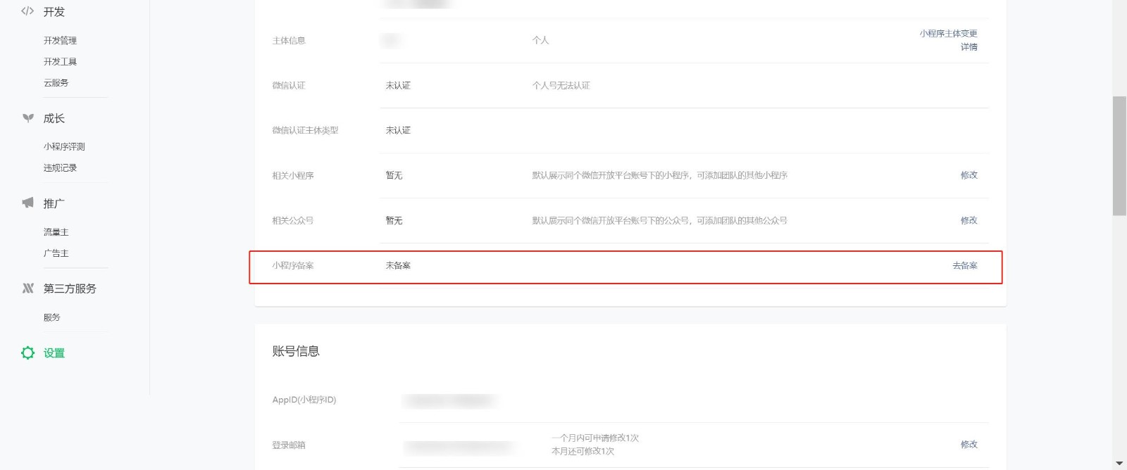 也可以在小程序管理后臺設置模塊-小程序備案,點(diǎn)擊【去備案】進(jìn)入備案流程