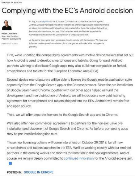 這些新的許可選項將于 2018 年 10 月 29 日生效,用于在歐洲經(jīng)濟區推出的所有新智能手機和平板電腦。我們將在未來(lái)幾周和幾個(gè)月內與我們的 Android 合作伙伴積極交涉并轉換新協(xié)議。當然,我們仍然致力于為 Android 生態(tài)系統提供創(chuàng )新。