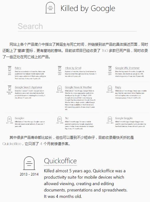 開(kāi)發(fā)者 Cody Ogden 通過(guò) GitHub 建立了一個(gè)網(wǎng)站“Killed by Google”,該網(wǎng)站收錄了 Google 淘汰的自家產(chǎn)品,作者形象地把網(wǎng)站叫做“谷歌產(chǎn)品的墓地”。