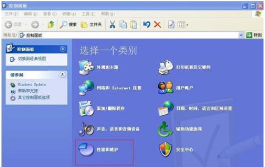 單擊“控制面板”之后會(huì )彈出如圖對話(huà)框,這時(shí)我們單擊對話(huà)框里面的“性能和維護”按鈕。