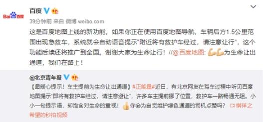 原來(lái),這是百度地圖上線(xiàn)的“急救車(chē)讓行播報”新功能,如果你正在使用百度地圖導航,車(chē)輛后方 1.5 公里范圍出現急救車(chē),系統就會(huì )自動(dòng)語(yǔ)音提示“附近將有救護車(chē)經(jīng)過(guò),請注意讓行”。