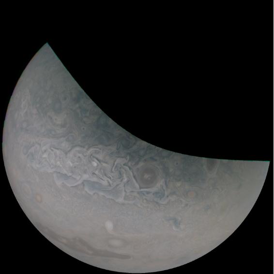 公民科學(xué)家 Kevin M. Gill 從 JunoCam 的原始圖像中提取圖像,對感興趣的區域進(jìn)行了顏色增強。