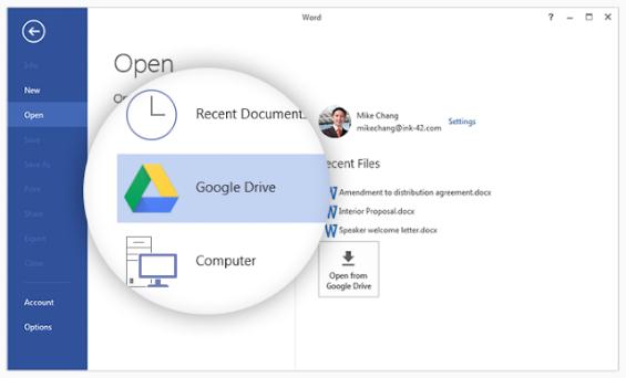 隨著(zhù) Google Drive File 系統的新插件開(kāi)始發(fā)揮作用,用戶(hù)將能夠保存和打開(kāi) Google Drive 文件,而無(wú)需使用 Office 插件提供的界面,常規菜單將可以直接調用 GDrive 中的文檔。