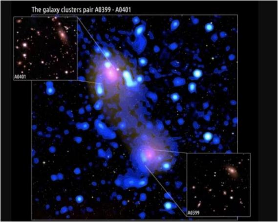 “阿貝爾0399”和“阿貝爾0401”距離地球大約10億光年,是兩個(gè)相鄰的星系團,星系團是有數百乃至數千個(gè)星系在引力作用下聚集在一起形成的集合體。在未來(lái)的數十億年內,這兩個(gè)巨大的龐然大物將有可能發(fā)生碰撞。目前這兩者之間距離大約1000萬(wàn)光年,由前文提到的一道長(cháng)長(cháng)的等離子體橋梁連接。