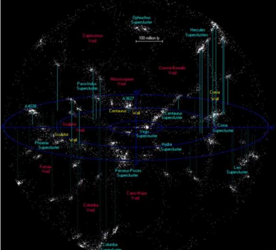 如果星系群是宇宙中的城市,那么“纖維”就像連接城市之間的高速公里。這幅圖展示的是距離地球周?chē)?億光年內所有已知的星系群分布情況(注意:阿貝爾0399和阿貝爾0401不在其中)