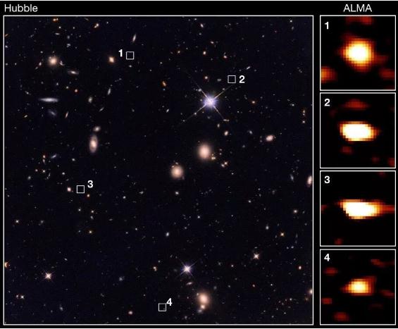 他們利用 ALMA 在較長(cháng)的遠紅外光波下對每一個(gè)候選星系進(jìn)行了分析研究,最終證實(shí)了 39 個(gè)候選星系。通過(guò)與之前已經(jīng)拍攝的照片對比,他們也證實(shí)了哈勃望遠鏡是看不到這些古老星系的,因此,他們將這些星系歸類(lèi)為“H-dropout”,意思是“被哈勃遺漏的信號”。