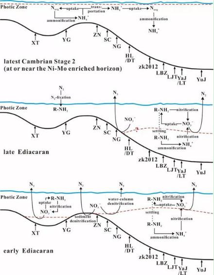 埃迪卡拉紀-寒武紀過(guò)渡時(shí)期揚子地區的氮循環(huán)模式示意圖