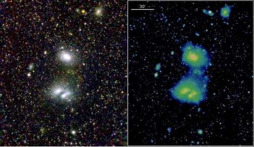 此次發(fā)布的X射線(xiàn)圖像展示了鄰近銀河系的大麥哲倫星云以及距地球約 8 億光年的兩個(gè)星系團。圖像中,大麥哲倫星云呈圓形紅色結構,里面的超新星遺跡清晰可見(jiàn);代號為 A3391 和 A3395 的兩個(gè)星系團呈藍綠色,正在發(fā)生相互作用。