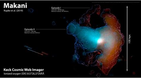 當然,這里并不是像文章開(kāi)頭故事中所描繪的超自然現象。根據光的顏色或頻率,天文學(xué)家推斷出它是由氧離子發(fā)射的。分析表明,星云的形成是兩種不同的氣體外流從中央星系傳播到 CGM 的結果。他們把星云命名為 Makani,在夏威夷語(yǔ)中意為風(fēng)。