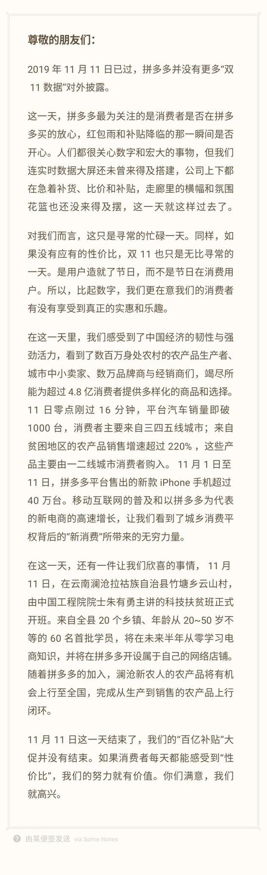 11月12日凌晨消息,拼多多發(fā)布公開(kāi)信稱(chēng),2019年11月11日已過(guò),公司并沒(méi)有更多“雙11數據”對外披露。