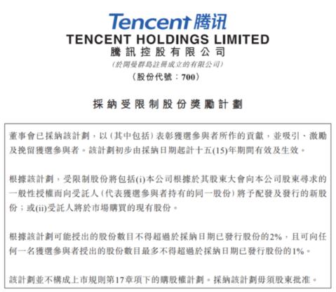 據11月25日晚上消息,騰訊控股在港交所發(fā)布公告,為表彰獲選參與者所做的貢獻,并吸引、激勵及挽留獲選參與者,公司董事會(huì )已采納受限制股份獎勵計劃,該計劃初步將于采納日期起15年內有效及生效。根據該計劃可能授出的股份數目不得超過(guò)于采納日期已發(fā)行股份的2%,且可向任何一名獲選參與者授出的股份數目最多不得超過(guò)于采納日期已發(fā)行股份的1%。