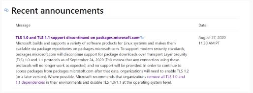 微軟為 Linux 系統構建并支持各種軟件產(chǎn)品,并通過(guò) packages.microsoft.com 上的軟件包存儲庫使它們可用。公告指出,“為了支持現代安全性標準,自 2020 年 9 月 24 日起,packages.microsoft.com 將停止對通過(guò)傳輸層安全性(TLS)1.0 和 1.1 協(xié)議下載軟件包。”