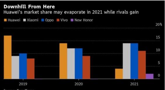 市場(chǎng)研究機構 TrendForce 稱(chēng),預計華為 2021 年全球智能手機市場(chǎng)份額將下降至4%,這與今年夏天華為的全球智能手機發(fā)貨量排名全球第一相比,將是一個(gè)急劇的下跌。