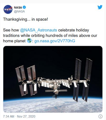 2020 年北美的感恩節對大多數人來(lái)說(shuō),就像今年大部分時(shí)間一樣,是一個(gè)混亂的節日。許多人因為社交距離的問(wèn)題無(wú)法探望家人。國際空間站上的宇航員與他們的家人的社交距離這樣一來(lái)就跟地球上的普通人差不多,但他們仍然用自己的方式慶祝感恩節。美國宇航局的宇航員凱特·魯賓斯最近就發(fā)文提到當國際空間站以每小時(shí) 17500 英里的速度環(huán)繞地球運行時(shí),宇航員們在國際空間站上做了什么。