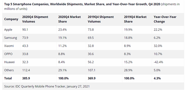 而據IDC最新公布的數據顯示,2020年第四季度,蘋(píng)果反超華為,以23.4%的高占比奪得榜首。反觀(guān)華為,則跌至全球第五位,市占比滑落至8.4%。