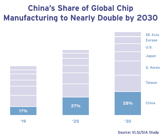 美國在芯片制造方面嚴重依賴(lài)亞洲供應商,這是美國在這個(gè)產(chǎn)業(yè)上的弱點(diǎn)。從長(cháng)期來(lái)看,中國大陸準備通過(guò)補貼大力建設 60 多家新晶圓廠(chǎng),甚至會(huì )在 2030 年會(huì )成為全球最大的芯片制造國,占比翻番,這對我們非常不利。