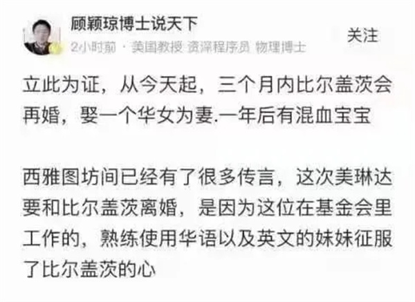 而在國內,社交媒體認證為美國教授、資深程序員、物理博士的社媒號“顧穎瓊博士說(shuō)天下”發(fā)布消息稱(chēng):立此為證,從今天起,三個(gè)月內比爾·蓋茨會(huì )再婚,娶一個(gè)華女為妻,一年后有混血寶寶。
