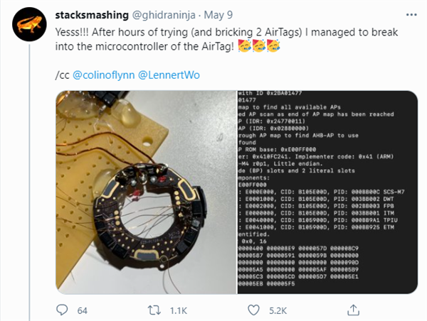 Stack Smashing 表示,在經(jīng)過(guò)數小時(shí)的嘗試后,他修改了 AirTag 的固件,最終發(fā)現微控制器可以重新編程,也就是說(shuō),黑客也可以用這種方式破解 AirTag,通過(guò)改變微控制器的編程從而改變其功能。