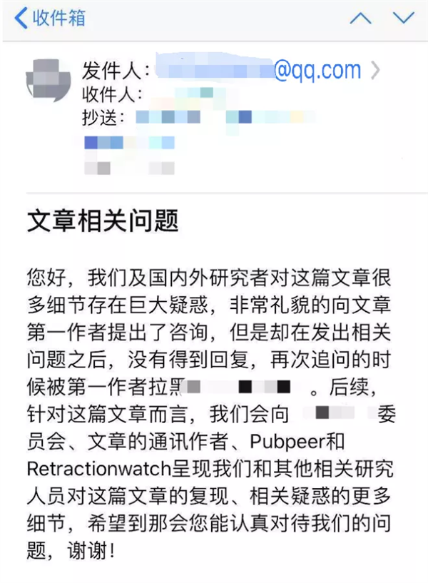 沒(méi)想到,稍晚時(shí)候,我竟然又收到了匿名者郵件,他帶著(zhù)威脅地聲稱(chēng)——文章有著(zhù)疑點(diǎn),“非常有禮貌” 地詢(xún)問(wèn)了我的學(xué)生,卻被拉黑了(見(jiàn)圖2)。