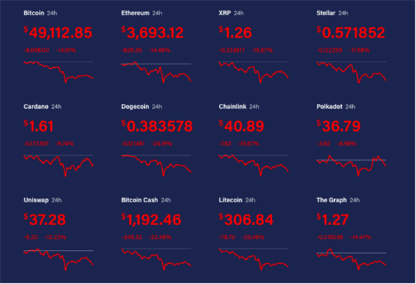 彼時(shí)比特幣閃崩也帶動(dòng)加密貨幣集體大跌。在比特幣跌破5萬(wàn)美元關(guān)口時(shí),瑞波幣跌幅逾15%,以太坊跌超9%至2253美元附近。在比特幣日內暴跌15%時(shí),以太坊暴跌20%,幣安幣暴跌17%,瑞波幣暴跌26%,狗狗幣暴跌19%,萊特幣暴跌28%。