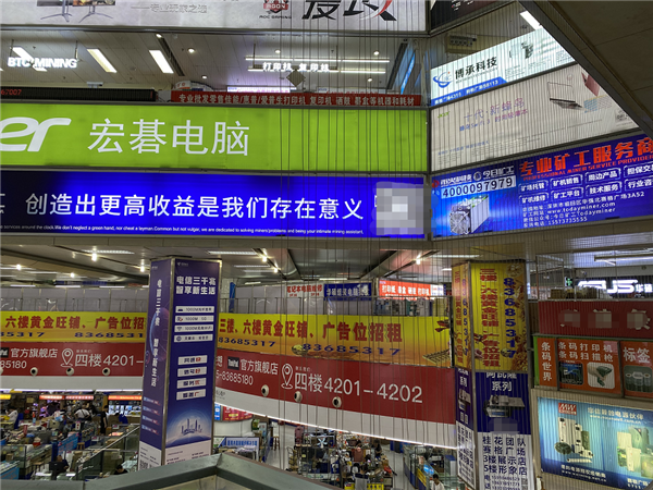 “服務(wù)好每一個(gè)礦工是公司第一天條,創(chuàng )造出更高收益是我們存在的意義”。華強北賽格電子市場(chǎng)顯眼位置懸掛著(zhù)某“專(zhuān)業(yè)礦工服務(wù)商”的橫幅。