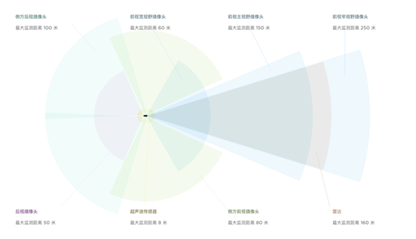 其中,前視攝像頭采用三目配置,主攝像頭能夠覆蓋大多交通場(chǎng)景,探測距離達到150米。前視寬視野攝像頭擁有120度魚(yú)眼鏡頭,能夠拍攝交通信號燈、距離較近的障礙物,最大探測距離為60米。前視窄視野攝像頭用于拍攝遠距離物體,適用于高速場(chǎng)景,最大探測距離為250米。