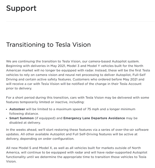 在特斯拉官網(wǎng)的支持頁(yè)面上,特斯拉詳細介紹了向純視覺(jué)過(guò)渡的過(guò)程。
