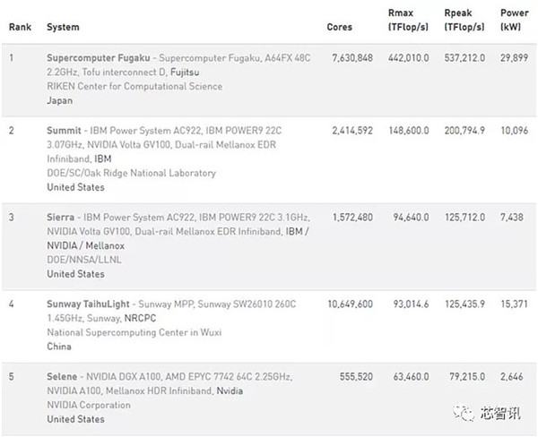 2020超級計算大會(huì )(SC20):日本超級計算機“富岳”世界第一,美國的 Summit 位列第二,第三是美國的Sierra,第四為中國的“神威·太湖之光” ,第五位是美國的Selene。