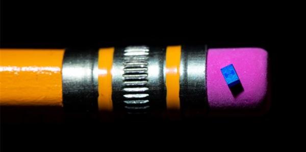 放置在鉛筆橡皮擦尖端的自旋量子位芯片,圖片源自 Walden Kirsch/Intel