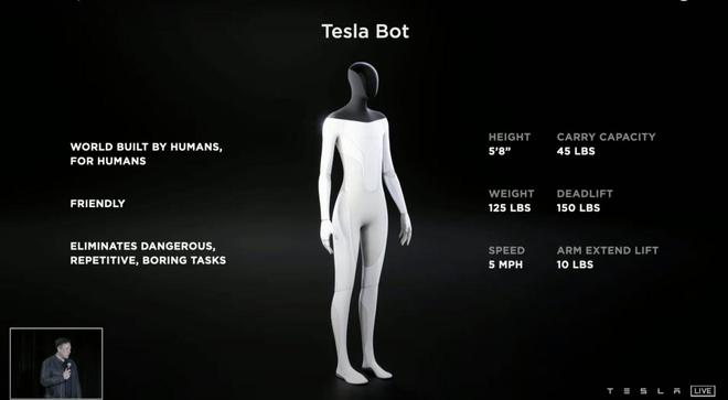 從發(fā)布會(huì )上透露的信息來(lái)看,Tesla Bot 機器人有 1.72 米高,56.6 千克重,類(lèi)似一個(gè)成年人的體型設定。它在臉部還會(huì )有一個(gè)顯示屏幕,用來(lái)作為顯示裝置。