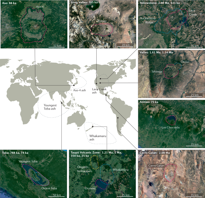 這些事件包括從 24000 年前新西蘭 Taupō火山的最新噴發(fā),到大約 200 萬(wàn)年前美國黃石公園的最古老的噴發(fā)。