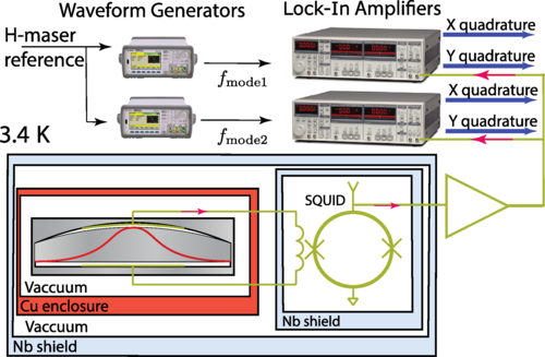 BAW 裝置被連接到一個(gè)被稱(chēng)為 SQUID 的超導量子干涉裝置上,該裝置對來(lái)自石英 BAW 的低電壓信號起著(zhù)極其敏感的放大器作用。這個(gè)組件被放置在多個(gè)輻射防護罩中,以保護其不受雜散電磁場(chǎng)的影響,并被冷卻到低溫,以便在 SQUID 放大器的幫助下將石英晶體的低能量聲波振動(dòng)檢測為大電壓。