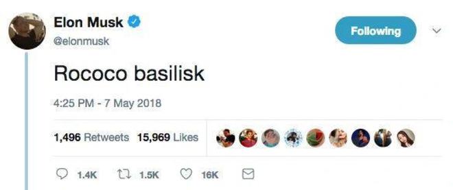 2018 年 4 月,馬斯克在推特上發(fā)了兩個(gè)詞,“Rococo basilisk(洛可可的蛇怪)”,玩了一把諧音梗,其原詞應該是“Roko’s Basilisk(羅科的蛇怪)”,后者是一個(gè)關(guān)于 AI 的荒謬論點(diǎn)。