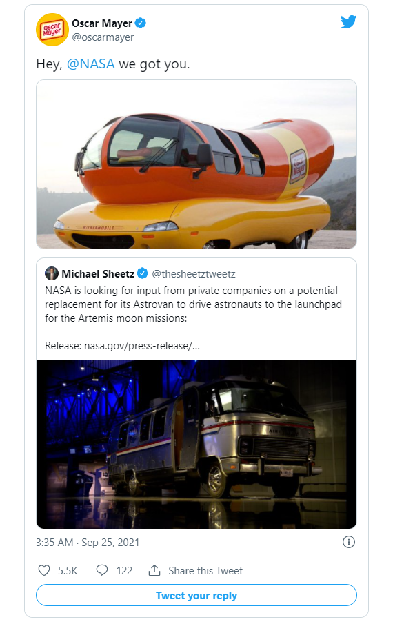 NASA 的車(chē)輛要求引起了 Oscar Mayer 公司的注意,該公司上周五在 Twitter 上寫(xiě)道:"嘿,NASA,我們明白你的意思了",同時(shí)附上一張 Wienermobile 的照片。