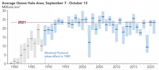 NASA 戈達德太空飛行中心地球科學(xué)首席科學(xué)家 Paul Newman 說(shuō):“這是一個(gè)大的臭氧洞,因為 2021 年的平流層條件比平均水平更冷,如果沒(méi)有《蒙特利爾議定書(shū)》,它將會(huì )更大。”