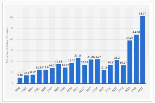 ▲微軟 2002-2021 財年凈利潤變化,公司在 2005-2015 財年間陷入低迷。來(lái)源:statista