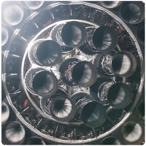 視頻中可以看到,火箭底部的發(fā)動(dòng)機有 29 個(gè),中央的 9 個(gè)發(fā)動(dòng)機為一組,可以大范圍旋轉改變方向,便于火箭姿態(tài)的調整。