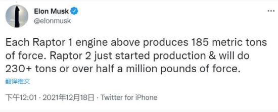 馬斯克還表示,一個(gè) Raptor 1 猛禽一代發(fā)動(dòng)機可以產(chǎn)生 185 公噸的推力,而 Repter 2 發(fā)動(dòng)機剛剛開(kāi)始量產(chǎn),單個(gè)推力提升至 230 噸。