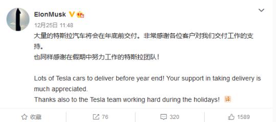 近日,特斯拉 CEO 埃隆·馬斯克發(fā)博稱(chēng):“大量的特斯拉汽車(chē)將會(huì )在年底前交付,非常感謝各位對我們交付工作的支持,也同樣感謝在假期中努力工作的特斯拉團隊!”