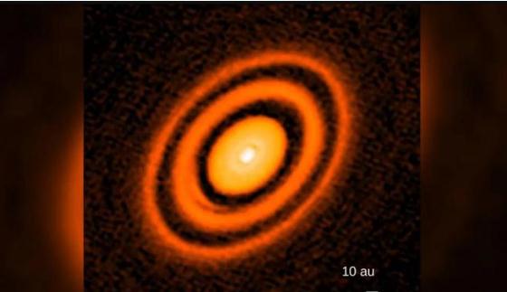 圖1:阿塔卡瑪大型毫米波/亞毫米波天線(xiàn)陣拍攝的假彩色圖像,顯示名為 HD163296 的年輕恒星(不是太陽(yáng))周?chē)袎m埃環(huán)圍繞
