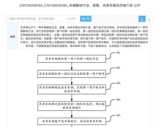 專(zhuān)利摘要顯示,本申請公開(kāi)了一種車(chē)輛解鎖方法,該方法先獲取第一用戶(hù)的第一指紋信息,第一指紋信息是通過(guò)第一指紋采集模組采集的,第一指紋采集模組安裝在共享車(chē)輛上,且第一指紋信息用于請求解鎖共享車(chē)輛;然后獲取第一指紋信息關(guān)聯(lián)的第一用戶(hù)賬號;解鎖共享車(chē)輛,關(guān)聯(lián)第一用戶(hù)賬號和共享車(chē)輛,用于基于第一用戶(hù)賬號,對使用共享車(chē)輛產(chǎn)生的資源信息進(jìn)行統計。