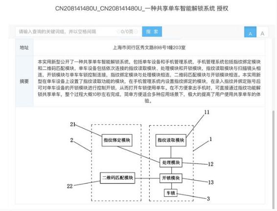 天眼查顯示,哈啰出行所屬的上海鈞正網(wǎng)絡(luò )科技有限公司曾于 2018 年 11 月 23 日公布名為“CN208141480U_一種共享單車(chē)智能解鎖系統”的專(zhuān)利。其摘要顯示,本實(shí)用新型公開(kāi)了一種共享單車(chē)智能解鎖系統,包括單車(chē)設備和手機管理系統,手機管理系統包括指紋綁定模塊和二維碼匹配模塊,單車(chē)設備包括依次連接的指紋讀取模塊、處理模塊和開(kāi)鎖模塊。