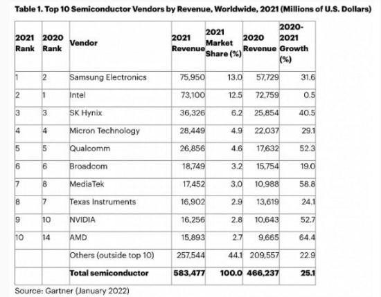 據美國研究機構 Gartner 的數據,2021 年半導體市場(chǎng)增長(cháng)了 25.1%,達到 5835 億美元,銷(xiāo)售額首次突破 5000 億美元。而三星超過(guò)英特爾,成為年收入最高芯片制造商。
