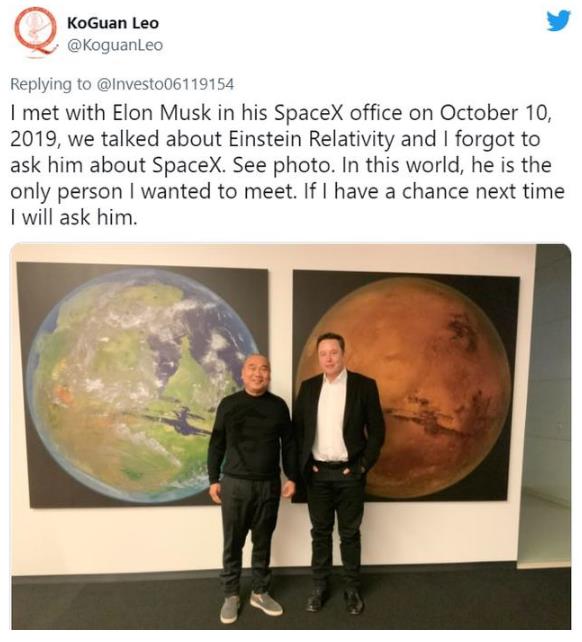 廖凱原在其社交媒體上寫(xiě)道:“在2019年10月10日,我與馬斯克在他的SpaceX辦公室進(jìn)行了會(huì )面,我們討論了愛(ài)因斯坦的相對論,(相談甚歡以至于)忘了向其詢(xún)問(wèn)有關(guān)SpaceX的事情。”