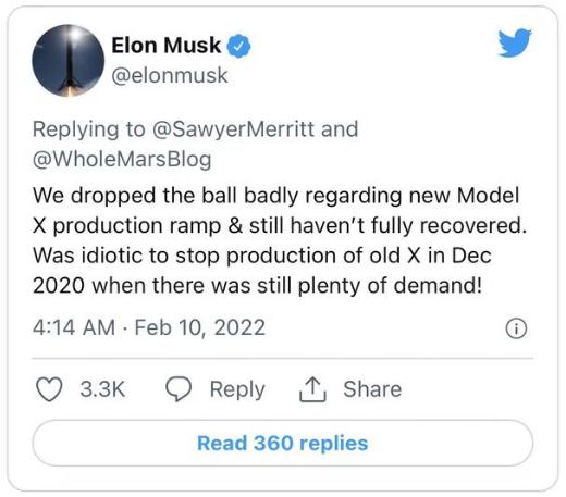 馬斯克通過(guò)個(gè)人社交媒體 Twitter 表示,特斯拉在一年多前準備推出新款 Model X 時(shí)就暫停了原有車(chē)型的生產(chǎn),這是一個(gè)“愚蠢”的決定。特斯拉于去年秋天推出新款 Model X 電動(dòng)汽車(chē)。馬斯克表示,2020 年 12 月開(kāi)始暫停生產(chǎn)老款 Model X 所產(chǎn)生的影響目前仍困擾著(zhù)特斯拉。