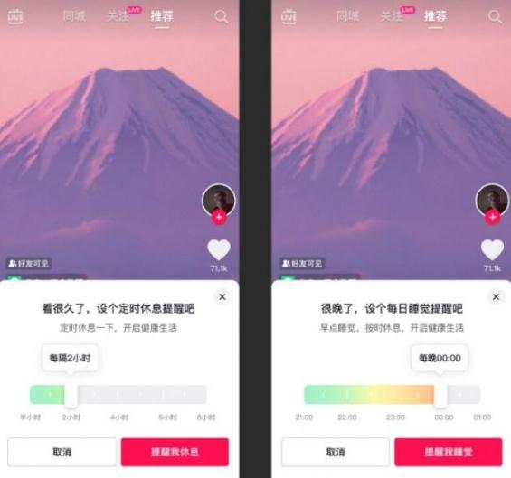 近日,抖音升級時(shí)間管理工具,加強對老年用戶(hù)的休息提醒。用戶(hù)可自行設置休息提醒和睡眠提醒時(shí)間,當到達約定時(shí)間后會(huì )收到風(fēng)景紀錄片內容的提醒頁(yè)面。同時(shí),針對老年用戶(hù)的認知行為特點(diǎn),頁(yè)面中會(huì )出現語(yǔ)音播報,將提醒內容語(yǔ)音告知用戶(hù)。