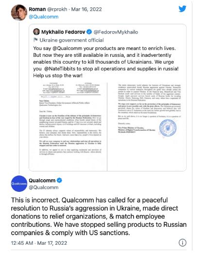 高通負責政府事務(wù)的高級副總裁內特?提比茨 (Nate Tibbits) 在 Twitter 上披露了這一舉措,他是在回應烏克蘭副總理米哈伊洛?費多羅夫 (Mykhailo Fedorov) 的評論。