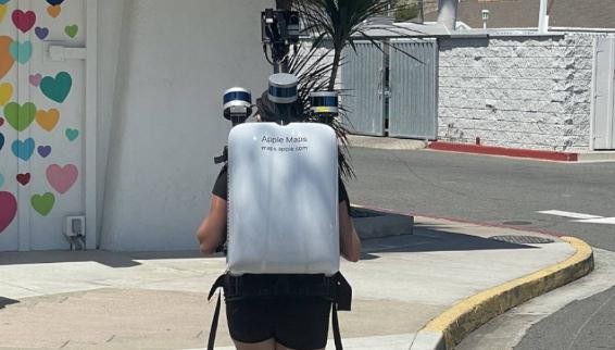 從圖中可以看到,蘋(píng)果的工作人員背著(zhù)一個(gè)大背包,上面布滿(mǎn)了攝像頭和傳感器,將收集超過(guò) 85 個(gè)特定城鎮和行政區的地圖數據。
