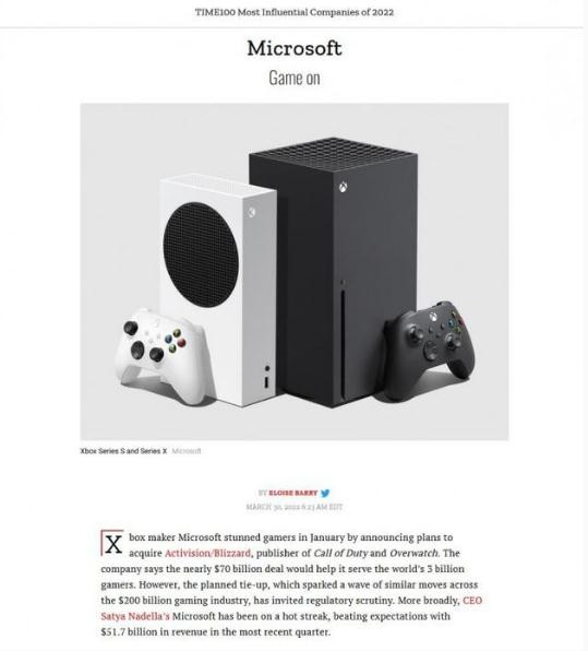 《時(shí)代》周刊表示:“Xbox 制造商微軟在 1 月份宣布計劃收購《使命召喚》和《守望先鋒》的發(fā)行商動(dòng)視/暴雪,這讓玩家感到震驚。該公司表示,這筆近 700 億美元的交易將幫助它為全球 30 億游戲玩家服務(wù)。然而,這一計劃中的合作,引發(fā)了整個(gè) 2000 億美元的游戲行業(yè)的類(lèi)似舉措的浪潮,已經(jīng)招致了監管部門(mén)的審查。更廣泛地說(shuō),首席執行官薩蒂亞-納德拉的微軟公司一直處于火熱狀態(tài),最近一個(gè)季度的收入為 517 億美元,超過(guò)了預期”。