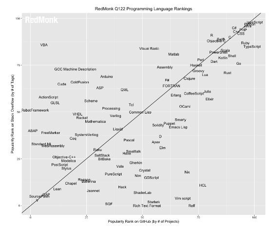 RedMonk 編程語(yǔ)言排行榜通過(guò)追蹤編程語(yǔ)言在 GitHub 和 Stack Overflow 上的代碼使用情況與討論數量,統計分析后進(jìn)行排序,其旨在深入了解潛在的語(yǔ)言采用趨勢。該榜單一年發(fā)布兩次,這是今年的第一份榜單。